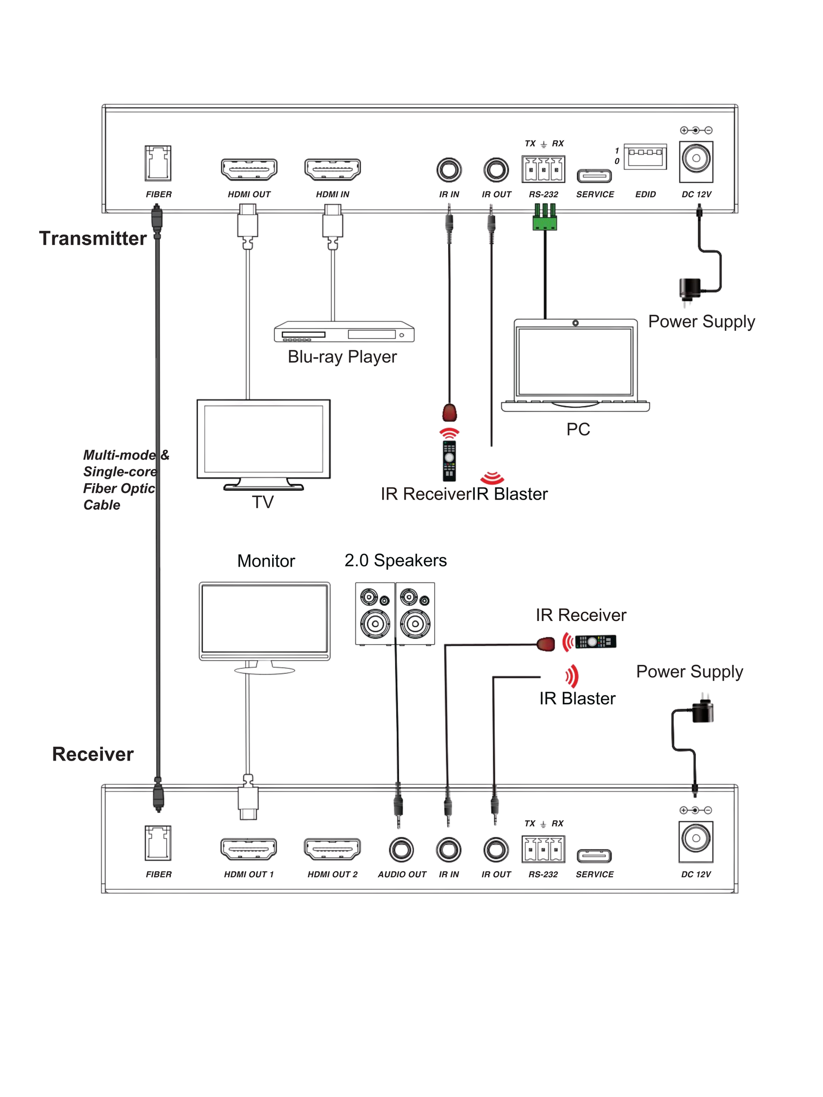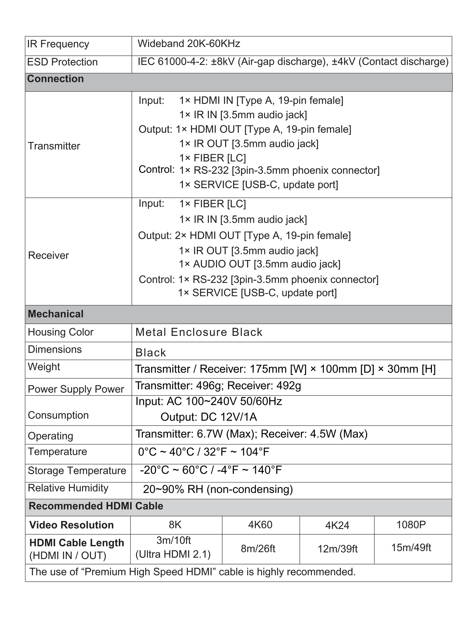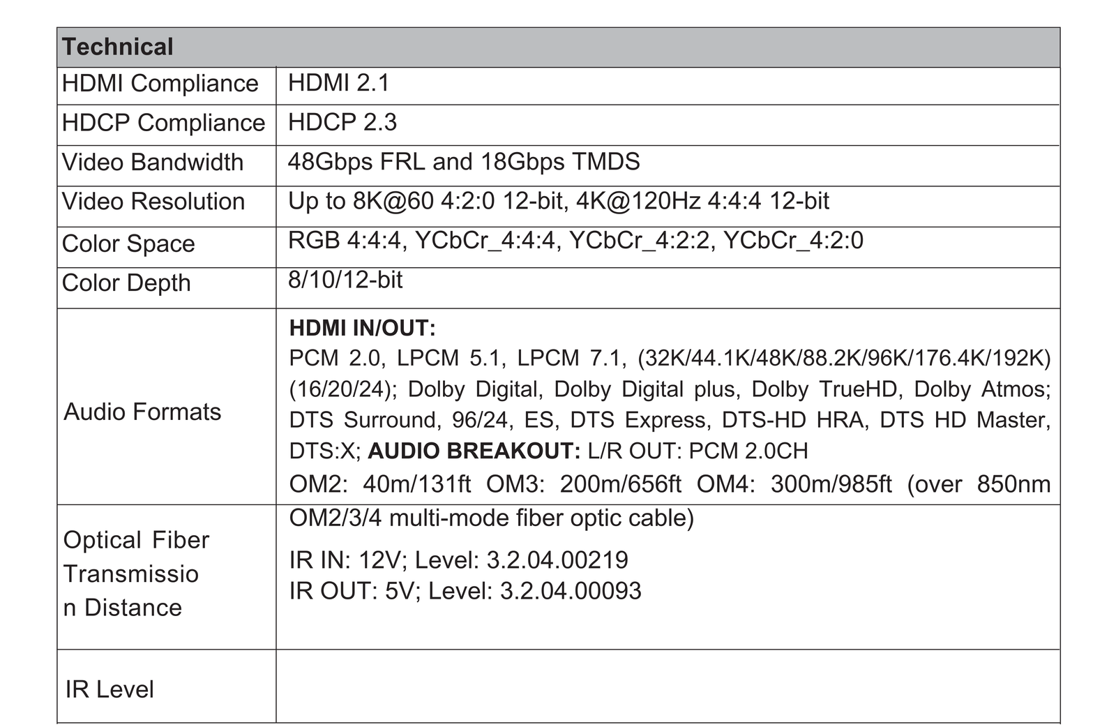 ☆ Compliant with HDCP 2.3 ☆ Support video bandwidth up to 48Gbps FRL and 18Gbps TMDS ☆ Video resolution up to 8K@60 4:2:0 12-bit, 4K@120Hz 4:4:4 12-bit, as specified in HDMI 2.1 ☆ Transmission distance can be up to 300m/984ft over an OM4 fiber optic cable ☆ Multi-mode fiber grade OM2/3/4 compliant ☆ Support EDID learning function on Transmitter ☆ Support analog audio de-embedding on Receiver ☆ VRR, ALLM, QMS, QFT, SBTM are supported ☆ HDR, HDR10, HDR10+, Dolby Vision, HLG pass-through are supported ☆ HDMI audio formats support Dolby Atmos, Dolby TrueHD, Dolby Digital Plus and DTS-HD Master Audio ☆ Bi-directional IR & RS-232 pass-throughData sheet