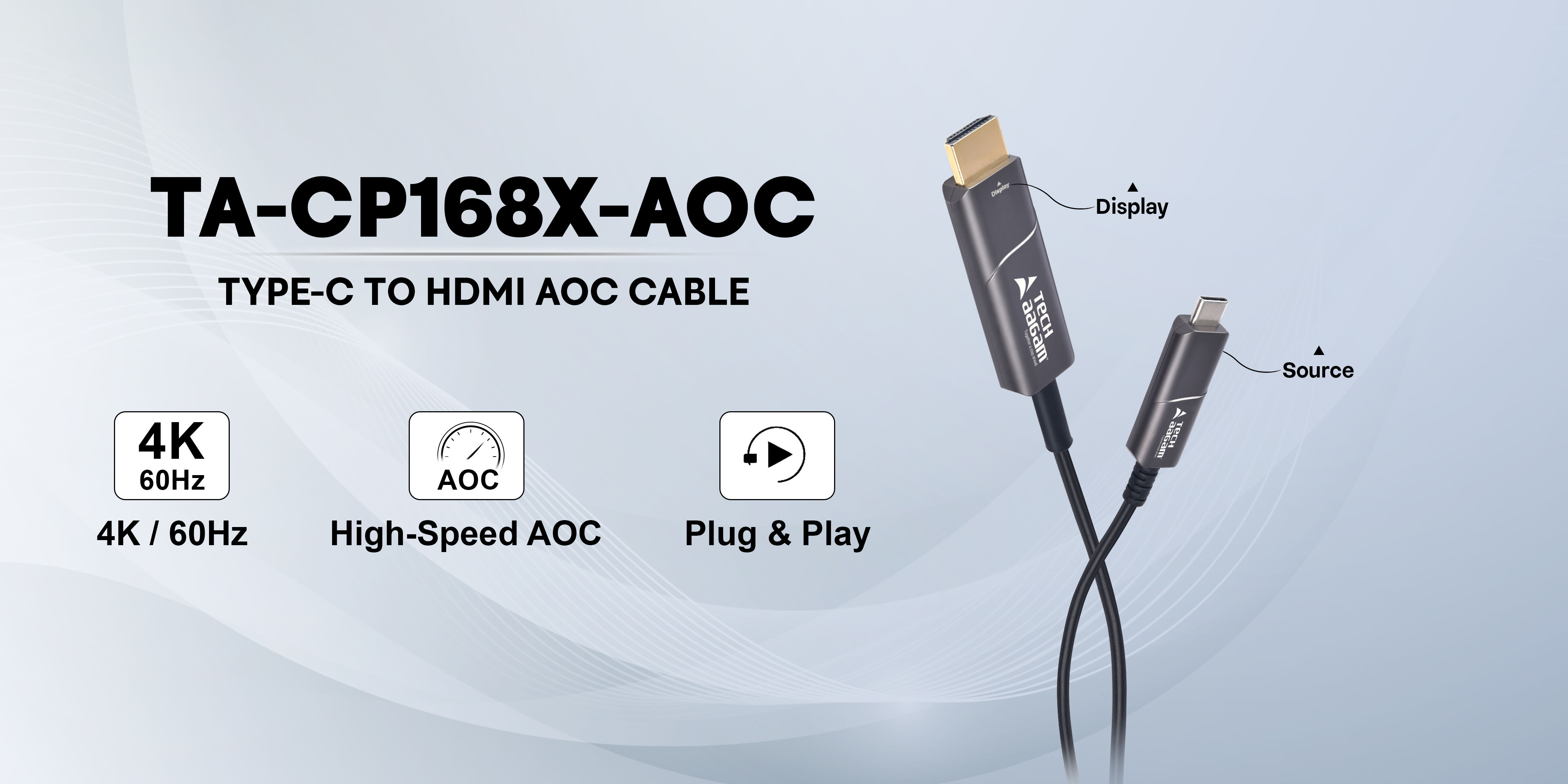 The Techaagam’s TA-CP168X-AOC USB Type-C to HDMI AOC (Active Optical Cable) is a high-performance, long-distance AV connectivity solution designed for transmitting ultra-high-definition video and audio from USB-C source devices to HDMI displays. By combining optical fiber for video signals with copper conductors for power and control, this hybrid cable delivers superior signal integrity, ultra-low attenuation, and complete immunity to electromagnetic interference. Supporting DisplayPort Alt Mode over USB-C, the cable enables seamless connection from laptops, workstations, and mobile devices to HDMI monitors, projectors, TVs, and LED displays—without the distance limitations of traditional copper cables. It is ideal for professional AV installations, conference rooms, digital signage, and large-venue applications.